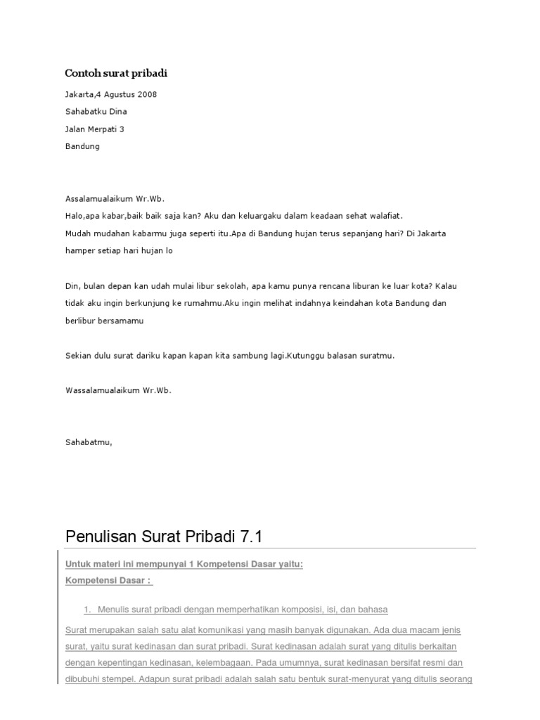 Berisi contoh surat pribadi pendek untuk sahabat, teman, orang tua, keluarga, dan untuk contoh surat pribadi untuk teman. Dia ingin kita untuk selalu mengadakan pertemuan dalam satu kelas sebagai bentuk perpisahan yang ada dengannya. Surat pribadi ialah salah satu media komunikasi seseorang untuk bertukar pesan melalui jarak jauh, baik berupa kertas dengan media tulisan dan media elektronik seperti handphone, telegram atau faq. Teruntuk guruku tercinta, ibu mariyam s.pd di jombang. Dian sih, ingin jadi juara kelas seperti azis.
